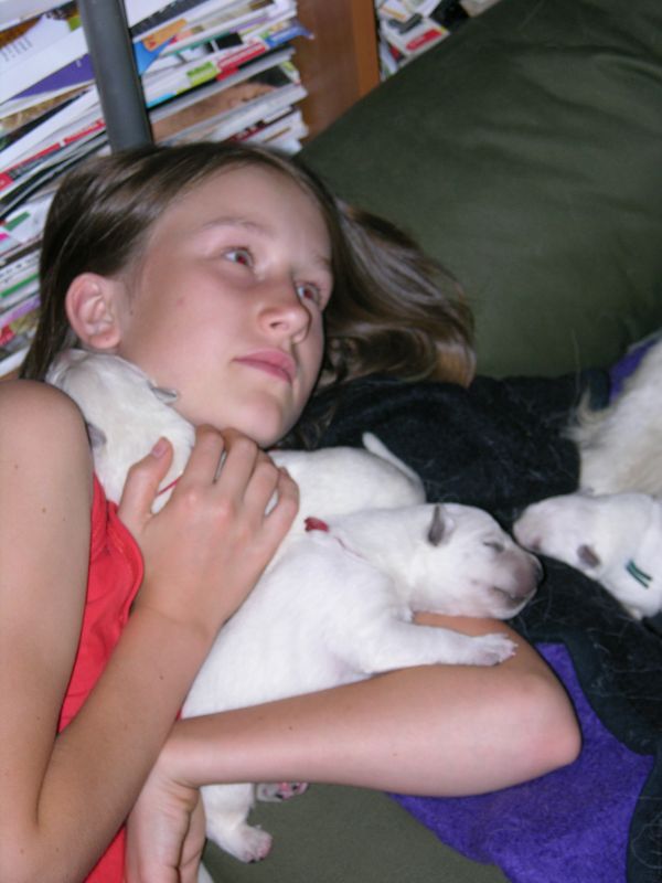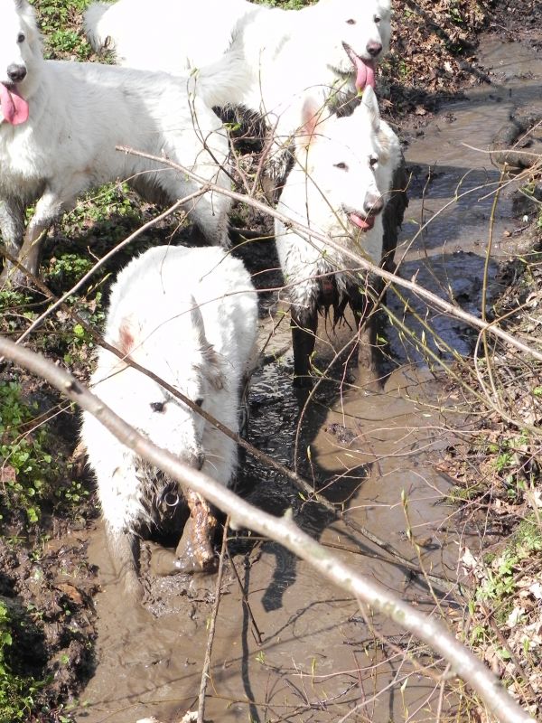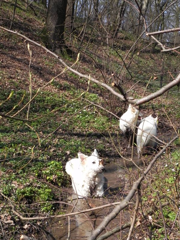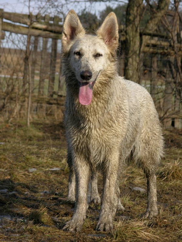 Przy takich panierkach przede wszystkim przydają się szampony tzw. "dirty dog", to są szampony bardzo mocno i dogłębnie myjące, usuwające cały brud, ale także całą warstwę tłuszczową, Po myciu takim szamponem robi się drugie mycie szamponem dopasowanym do szaty. Przy białych owczarkach najczęściej używa się szamponów wybielających, mają one najczęściej kolor granatowy, ciemnofioletowy lub butelkowozielony. Są to bardzo silnie skoncentrowane szampony, które MUSZĄ być rozcieńczane przed użyciem (nawet 1:20). Użycie skoncentrowanego szamponu kończy się niebieskimi albo zielonymi plamami na sierści, oczywiście nie takimi bardzo kolorowymi, ale widać że pies jest w plamy (nie wspomnę o uszkodzeniach włosa). Po takim myciu na włos nakłada się odżywkę dopasowaną do rodzaju szaty, przy szwajcarach to często odżywki do szaty podwójnej. Na szczęście szwajcary, pomimo białego koloru, nie są tak wymagające "picowania" jak inne rasy. Moje "matołki" też są nieczęsto kąpane, teraz mniej jeździmy na wystawy, to i takiego musu nie ma. A że jest to dla mnie coraz bardziej uciążliwe to i częstotliwość mniejsza. Mam niestety wannę i wsadzenie do niej takiego np.Maćka, który waży prawie 50 kg, a potem kilkukrotne namoczenie tej góry futra kończy sie takim bólem mojego kręgosłupa, że - same rozumiecie - nie śpieszę się do tego