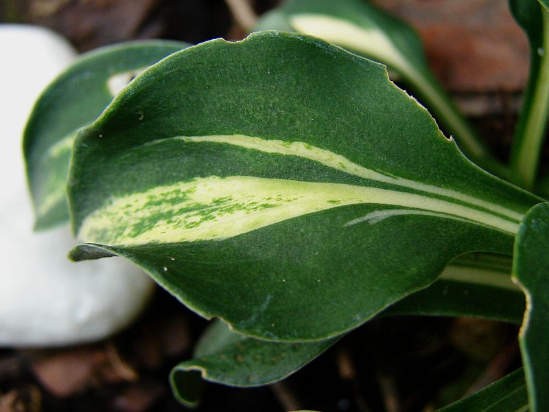Liście: podłużne, lekko falowane, twarde... ciemnozielone z białym centrum przechodzącym na łodygi... centrum nie jest w pełni stabilne, latem potrafi przybierać formę streaked... również w jego obrębie mogę pojawiać się zielonkawe przebarwienia