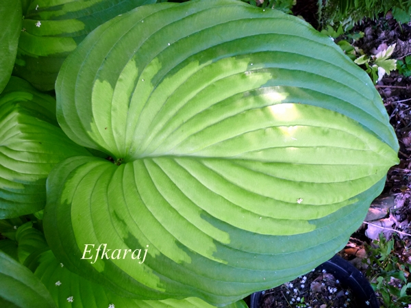 Liście duże, lekko falowane, sercowate, środek zielonkawy wiosną do złotożółtego w ciągu sezonu, otoczony ciemno zielonym marginesem, matowe