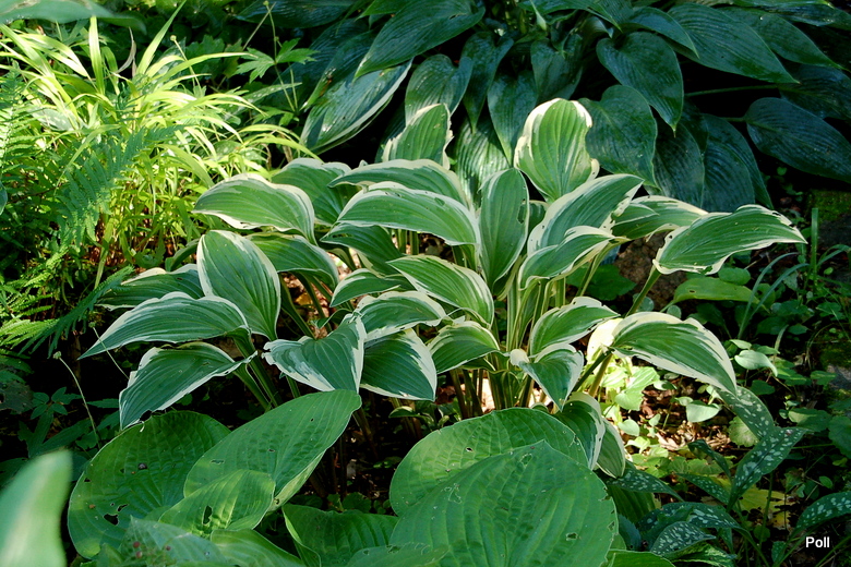Hosta Bold Ribbons na najstarszym hostowisku, wraz z innymi roślinami cienia