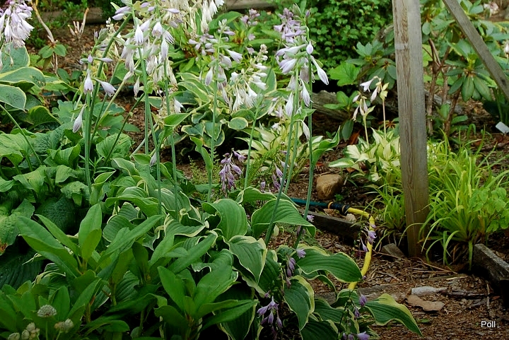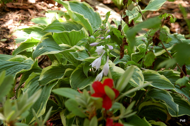 Hosta Silk Kimono rozpoczęła wegetacje nieco później, niż inne hosty, więc dopiero nabiera masy (w tle, różanecznik Dotella)