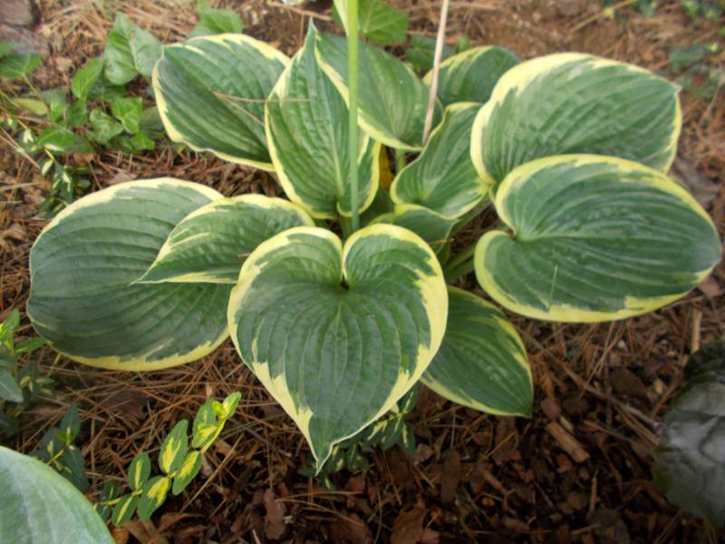 Rozmiar: ML (50-60 cm wysokości) Liście: sercowato-okragłe, grube, mocnej substancji; ciemnozielone z nieregularnym żółtym, bielejącym w trakcie sezonu, marginesem; błyszczące Kwiaty: bladolawendowe (VII) Zalecane stanowisko: od półcienia