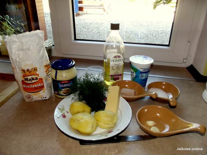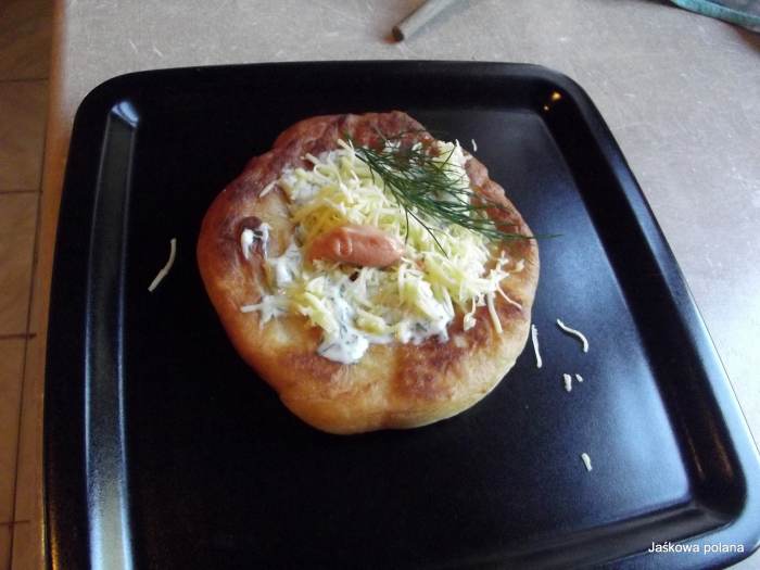 Ciasto podzielić na 8 części i uformować małe placuszki.Smażymy na złoto w głębokim oleju.(langosze powinny pływać) osącz z tłuszczu.