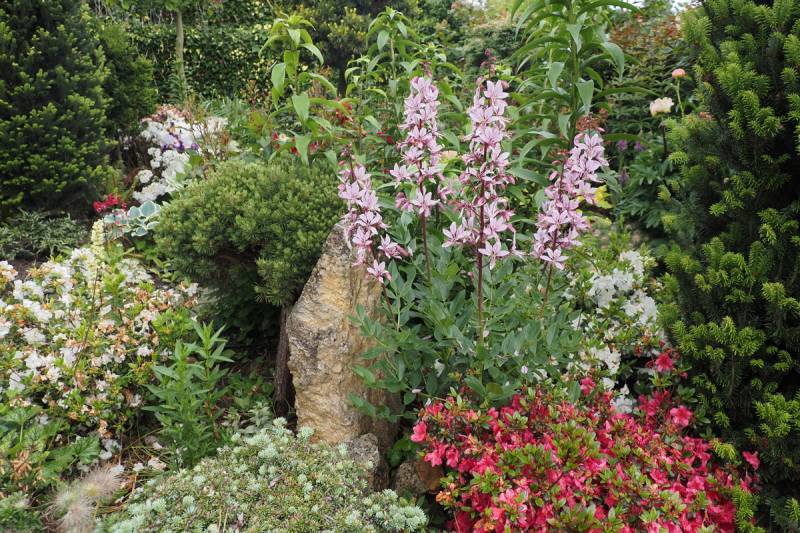 Kwiaty różowe i białe, z ciemniejszymi żyłkami, zebrane w grona na szczytach łodyg.
