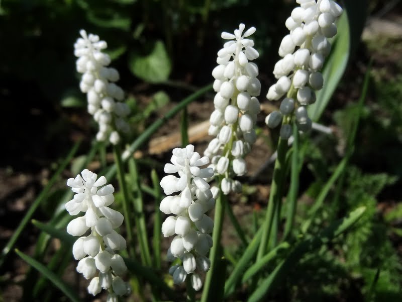 Szafirki armeńskie rosną w półcieniu hostowiska, ale gdy kwitna, jeszcze nie ma liści na drzewach. Gdy przekwitają, hosty już rosną w siłę i zasłaniają to, co najbardziej mnie denerwuje po kwitnieniu, czyli kupę liści. Kocham ich zapach. :tup
