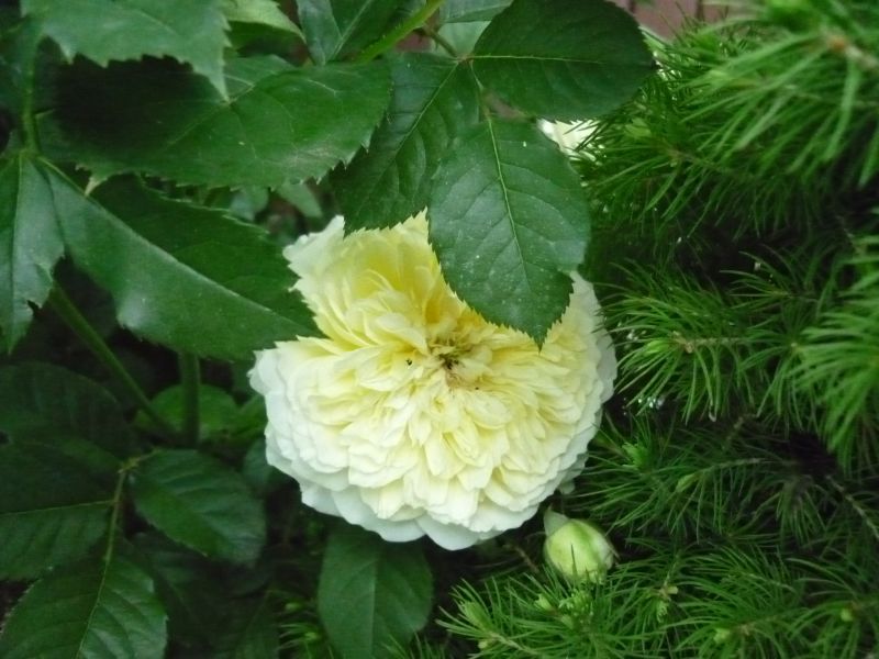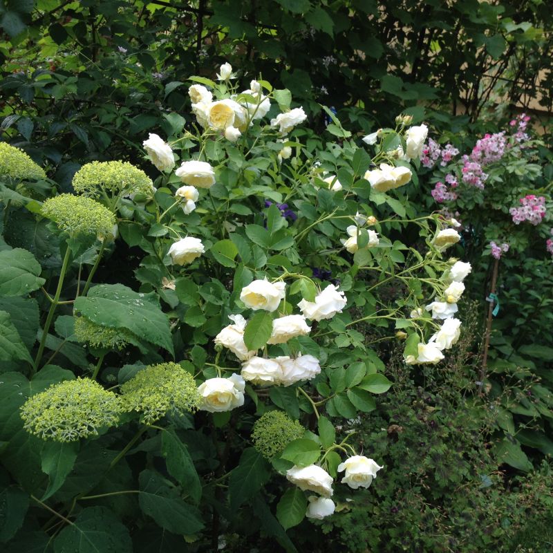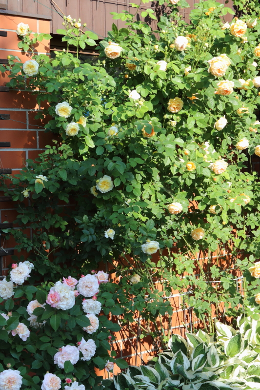 Moja druga najbardziej ulubiona róża po Pastelli. Stary krzak na ścianie domu w trudnym miejscu - wschodnia ściana - słońce rano i południe. Obok Gruss an Aachen, z tyłu Graham Thomas