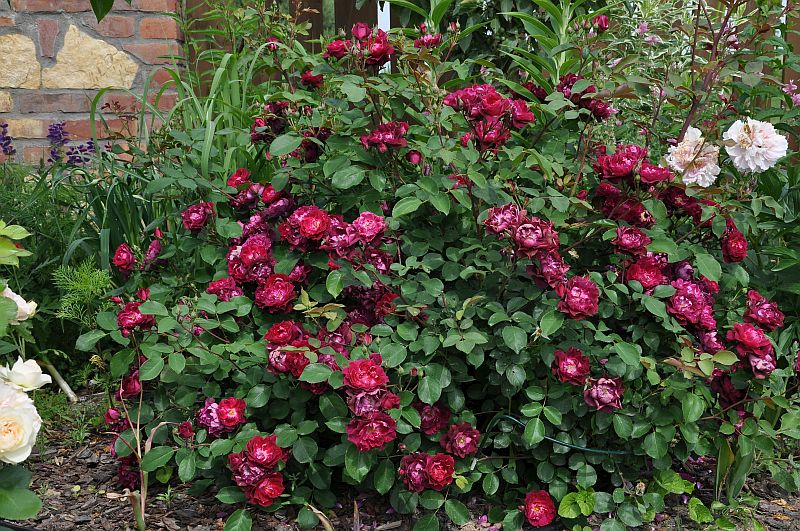 Ładnie się krzewi, może dorastać do 1,5 m, ale ja zwykle tnę krócej, zarówno na wiosnę, jak i po pierwszym kwitnieniu. Liście ciemno-zielone, niezbyt duże. Zwykle łapie plamistość w dolnej partii krzewu. Co ciekawe, mimo braku ochrony przeciwgrzybowej, a także bez obrywania chorych listków, choroba się nie rozprzestrzenia.