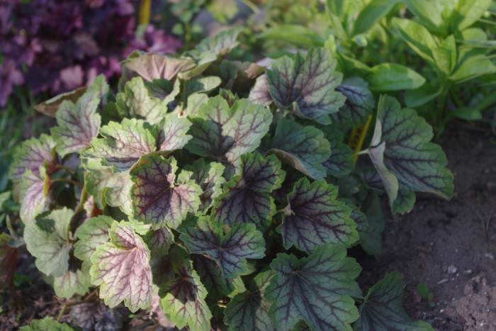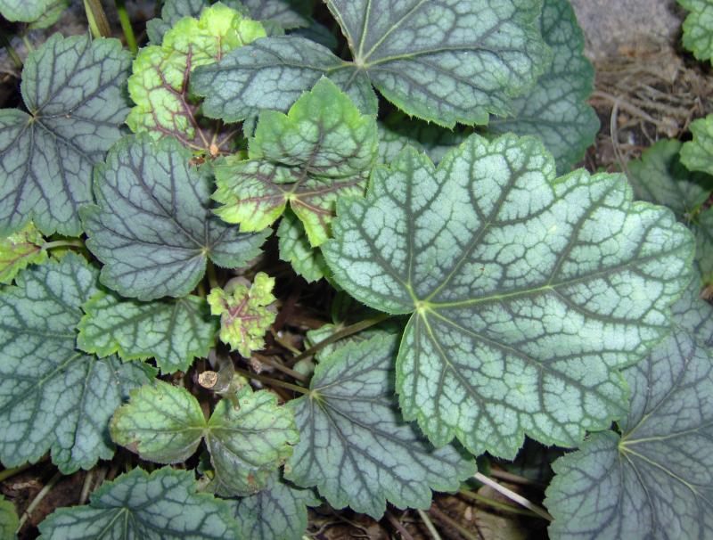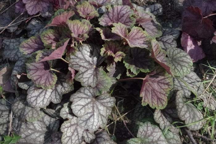 Rodzaj: Żurawka (Heuchera) Odmiana: Green Spice Wymiary : tworzy kępy o szerokości 40 cm i wysokości 25 cm . Kolorystyka: białe kwiaty. Liście metaliczne z mocno zaakcentowanym,szczególnie wiosna, zielonym marginesem z mocno kontrastowym, czerwonym unerwieniem . Warunki: stanowisko cieniste/pół-cieniste/na słonecznym wymaga wilgotniejszej gleby. Kwitnienie:maj/czerwiec.